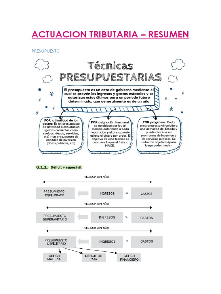 El documento resume temas tributarios como el presupuesto, derecho tributario, impuesto a las ganancias, bienes personales, IVA, seguridad social y procedimiento tributario. Incluye información sobre la Ley 11683 de procedimiento tributario.