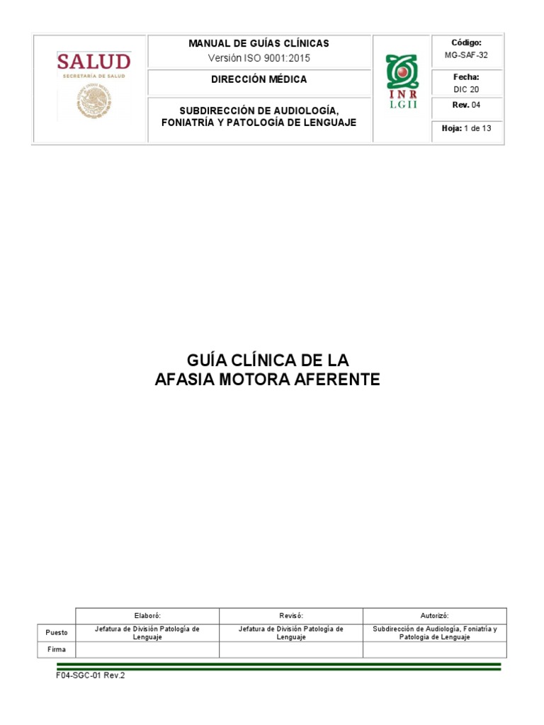 Afasia Motora Aferente, Revista Española de Neuropsicología 8, 1-2:43-61 (2006)