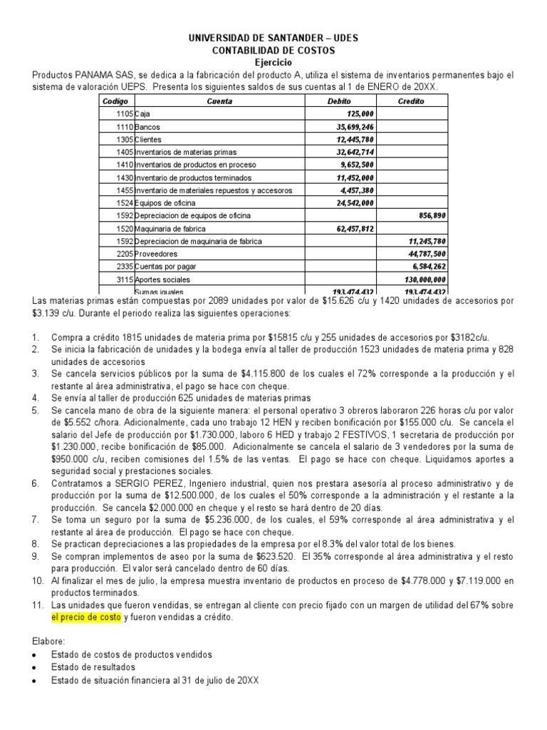 Productos PANAMA SAS, se dedica a la fabricación del producto A, utiliza el sistema de inventarios permanentes bajo el