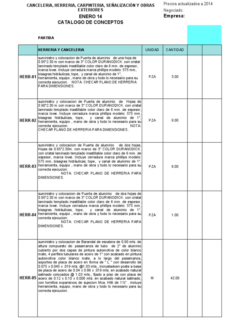CANCELERIA, HERRERIA, CARPINTERIA, SEÑALIZACIÓN Y OBRAS Precios actualizados a 2014