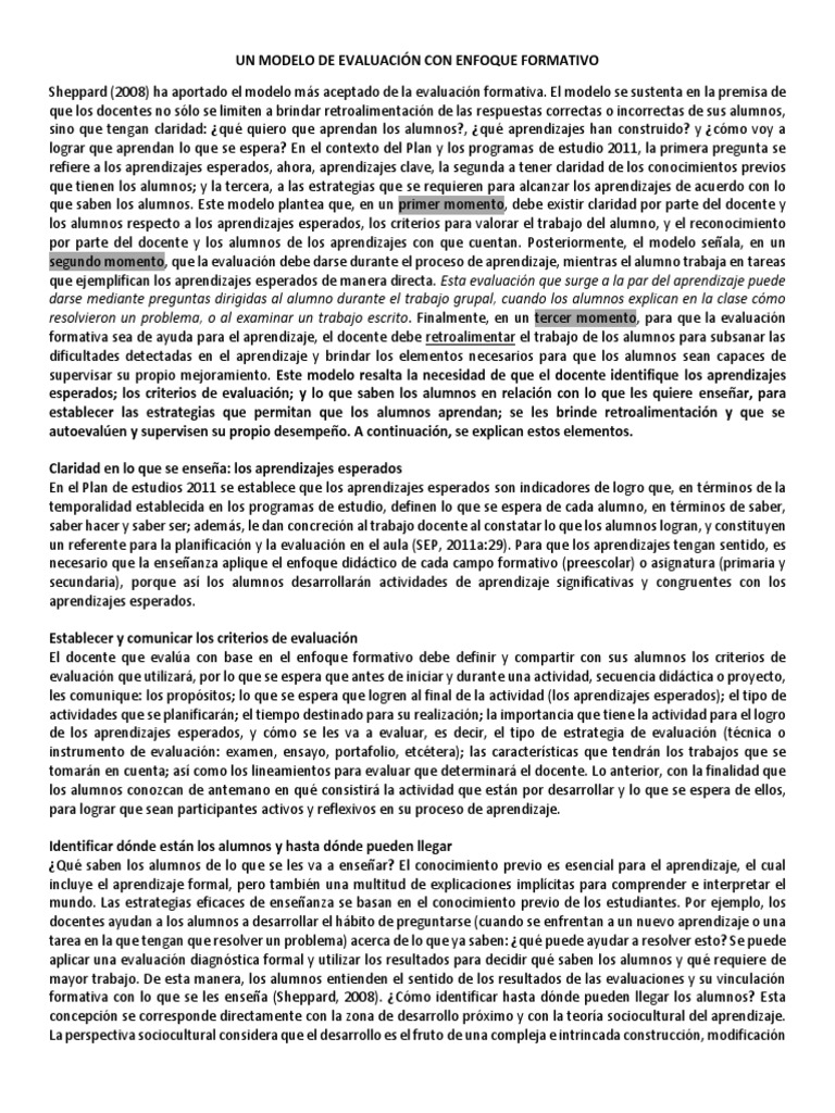 Sheppard (2008) ha aportado el modelo más aceptado de la evaluación formativa. El modelo se sustenta en la premisa de