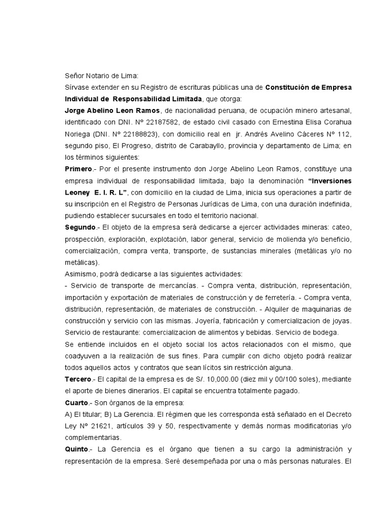 Primero.- Por el presente instrumento don Jorge Abelino Leon Ramos, constituye una