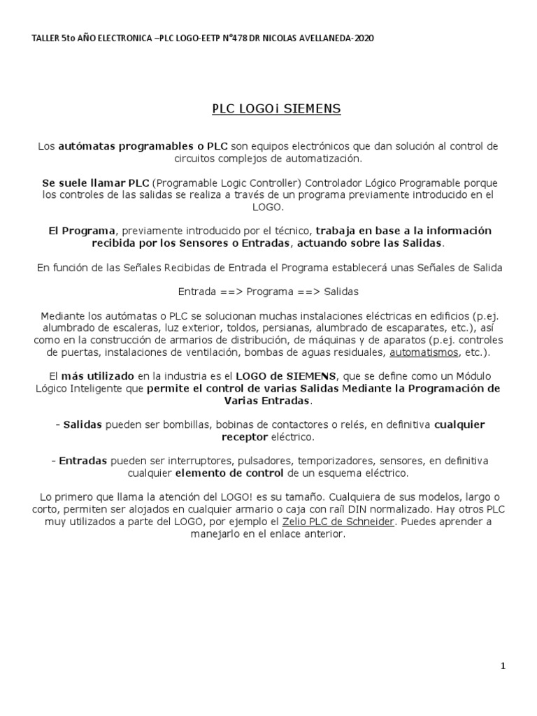 TALLER 5to AÑO ELECTRONICA –PLC LOGO-EETP N°478 DR NICOLAS AVELLANEDA-2020