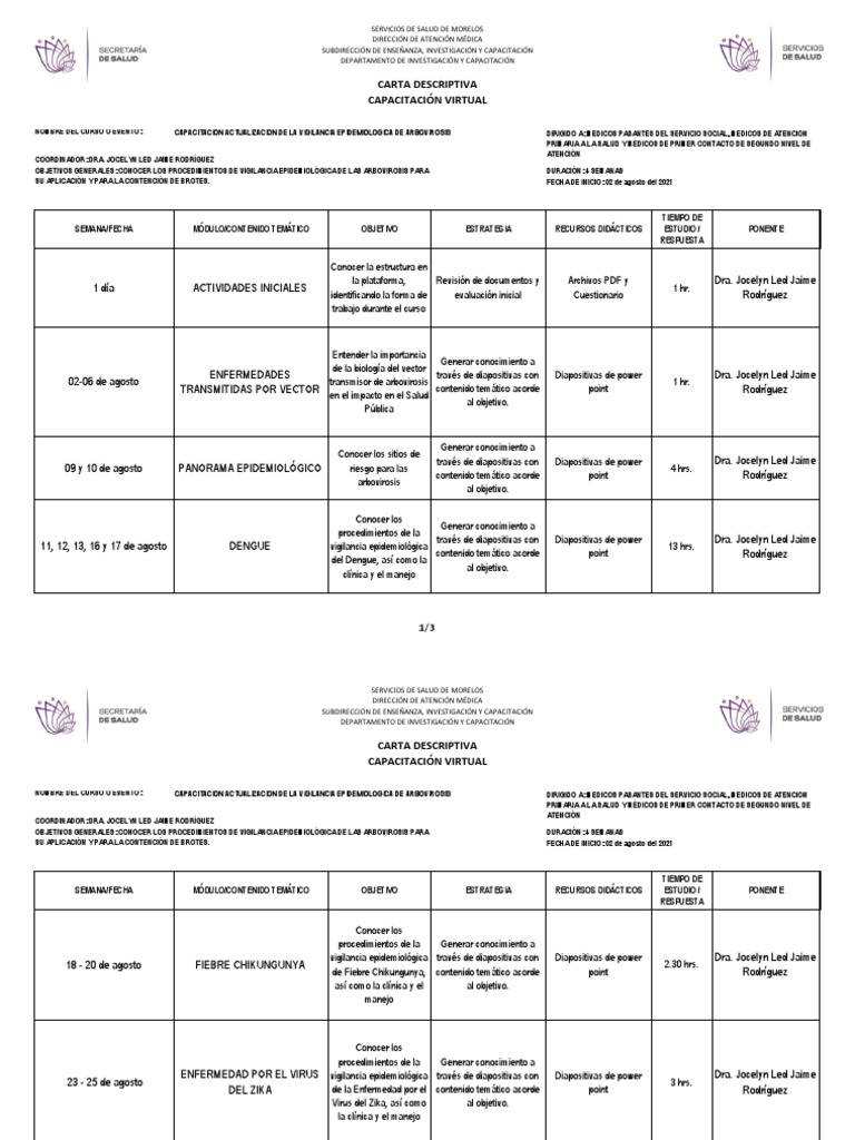 NOMBRE DEL CURSO O EVENTO: CAPACITACIÓN ACTUALIZACIÓN DE LA VIGILANCIA EPIDEMIOLÓGICA DE ARBOVIROSIS DIRIGIDO A: MÉDICOS PASANTES DEL SERVICIO SOCIAL, MÉDICOS DE ATENCIÓN