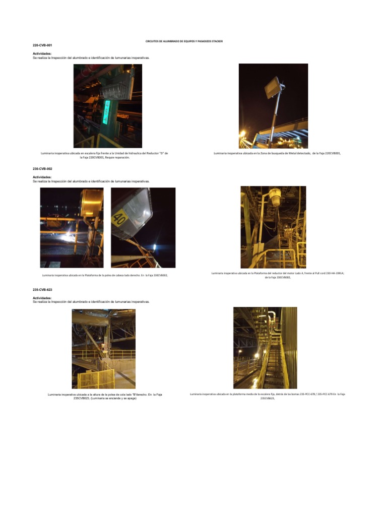 Luminaria inoperativa ubicada a la altura de la polea de cola lado "B"derecho. En la Faja Luminaria inoperativa ubicada en la plataforma media de la escalera fija, detrás de las bomas 235-PCC-678 / 235-PCC-679 En la Faja