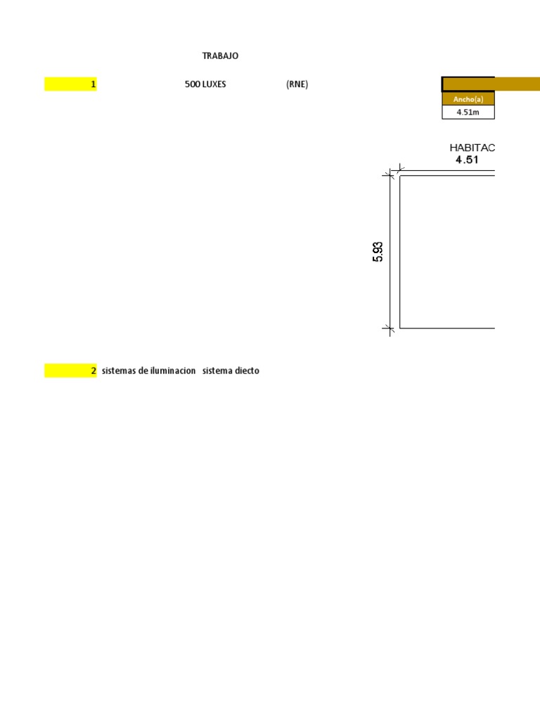 El documento detalla un trabajo relacionado con sistemas de iluminación, especificando un nivel de iluminación de 500 luxes y dimensiones del espacio a iluminar. Las dimensiones incluyen un ancho de 4.51m, largo de 5.93m, altura de 2.60m y un área total de 26.74m². Se menciona la implementación de dos sistemas de iluminación, uno de ellos de tipo directo.