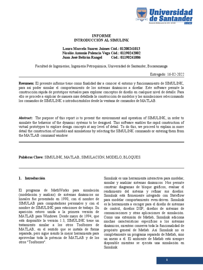 Abstract: The purpose of this report is to present the environment and operation of SIMULINK, in order to