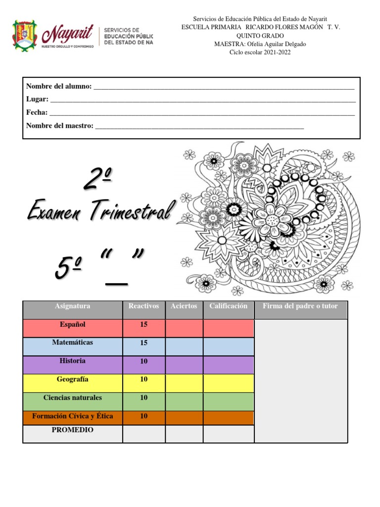 Asignatura Reactivos Aciertos Calificación Firma del padre o tutor