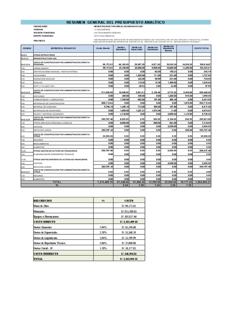 RESUMEN PRESUPUESTO ANALÍTICO - COSTO DIRECTO