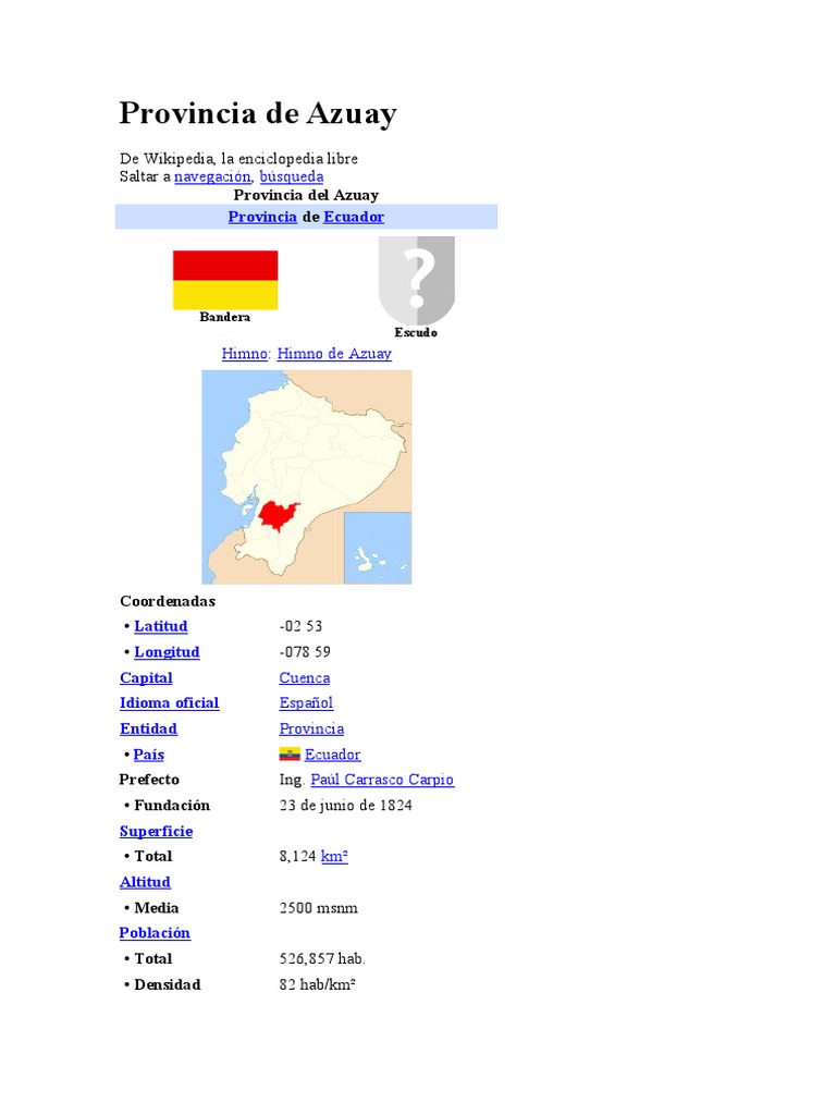 Azuay es una provincia en el sur del Ecuador, en la cordillera de los Andes. Al norte