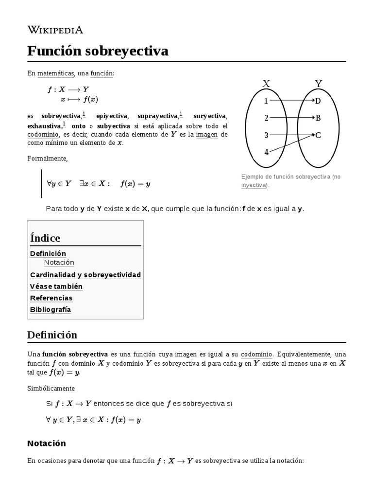 Una función sobreyectiva es una función cuya imagen es igual a su codominio. Equivalentemente, una