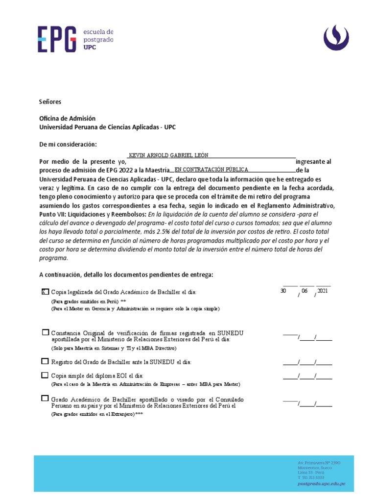 *La Escuela de Postgrado de la UPC aceptará la copia simple de mi Grado Académico de Bachiller siempre