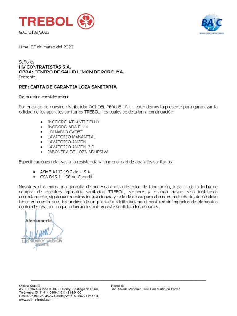 REF: CARTA DE GARANTIA LOZA SANITARIA