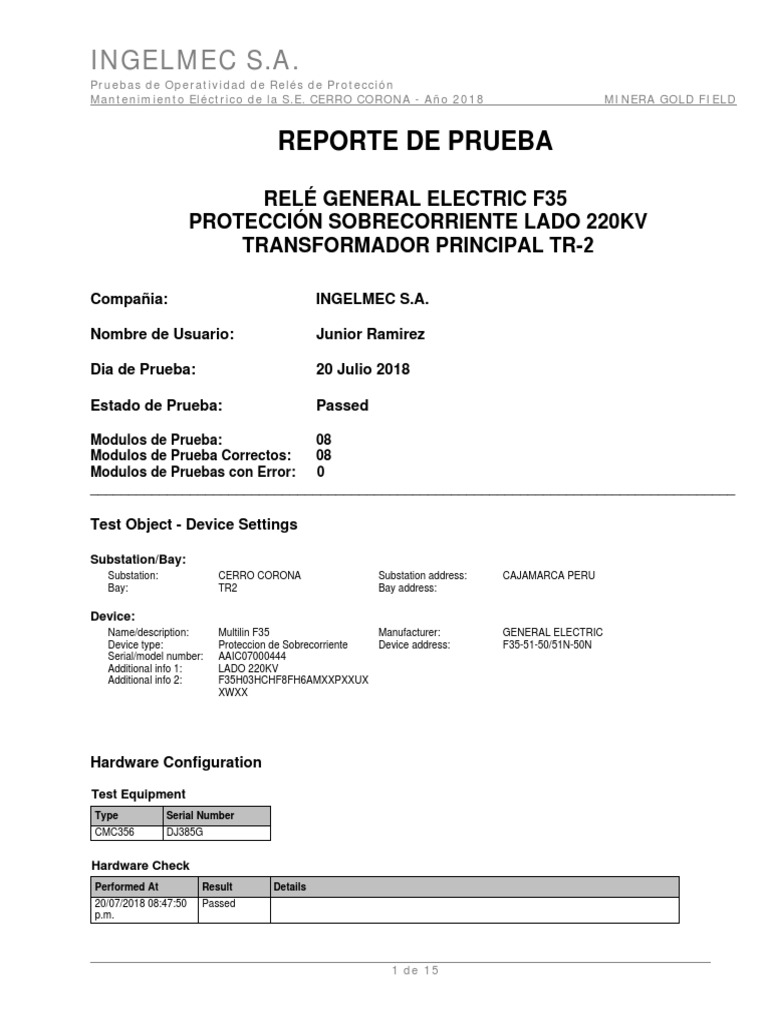 Mantenimiento Eléctrico de la S.E. CERRO CORONA - Año 2018 MINERA GOLD FIELD
