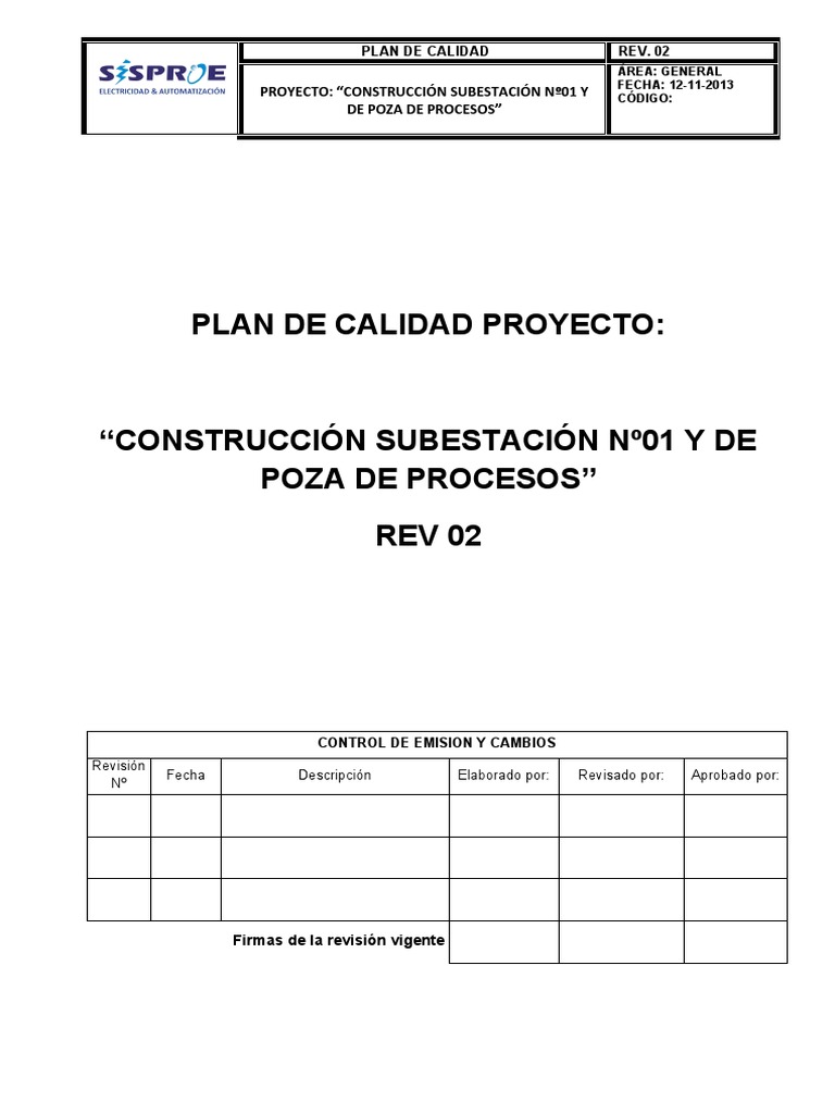 El Plan de Calidad será aplicable al proyecto “CONSTRUCCIÓN SUBESTACIÓN Nº01 Y POZA