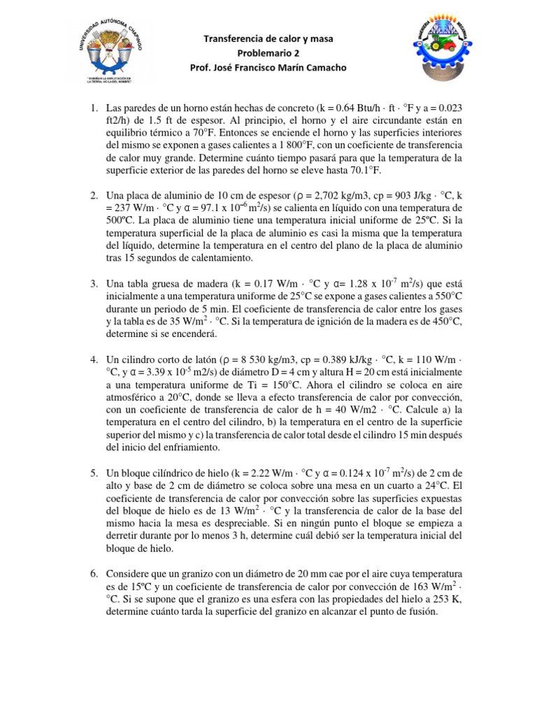 1. Las paredes de un horno están hechas de concreto (k = 0.64 Btu/h · ft · °F y a = 0.023