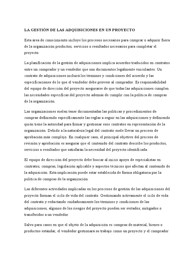 Esta gestión de las adquisiciones incluye la gestión del contrato y los procesos de