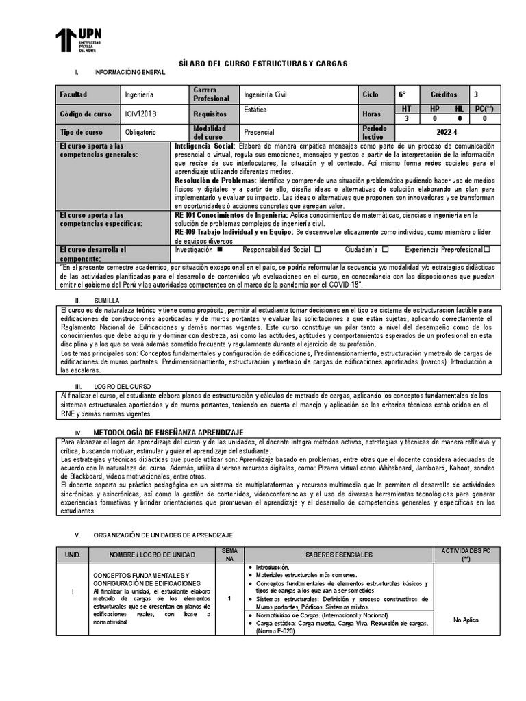 SÍLABO DEL CURSO ESTRUCTURAS Y CARGAS