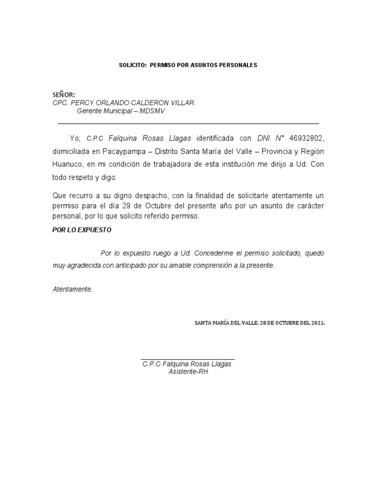Huanuco, en mi condición de trabajadora de esta institución me dirijo a Ud. Con