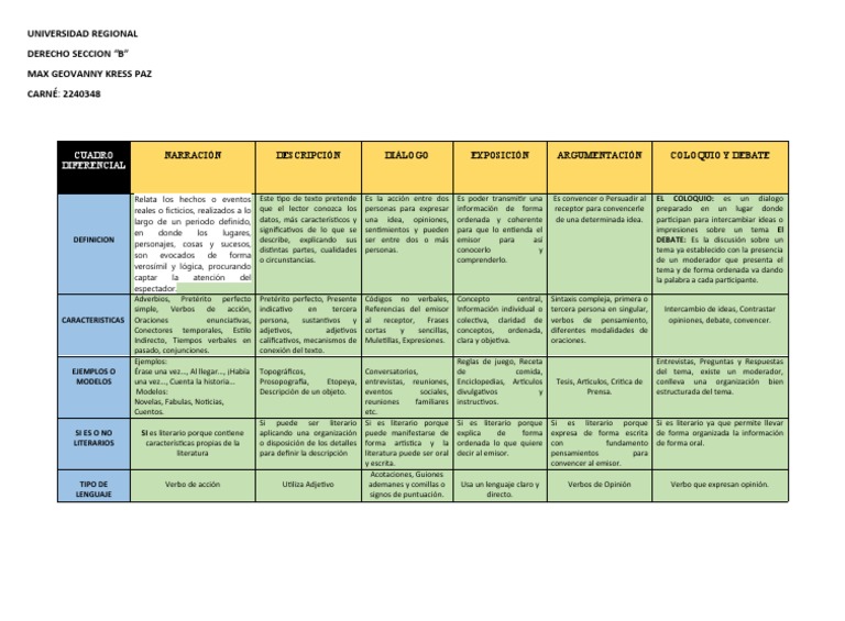 CUADRO NARRACIÓN DESCRIPCIÓN DIÁLOGO EXPOSICIÓN ARGUMENTACIÓN COLOQUIO Y DEBATE