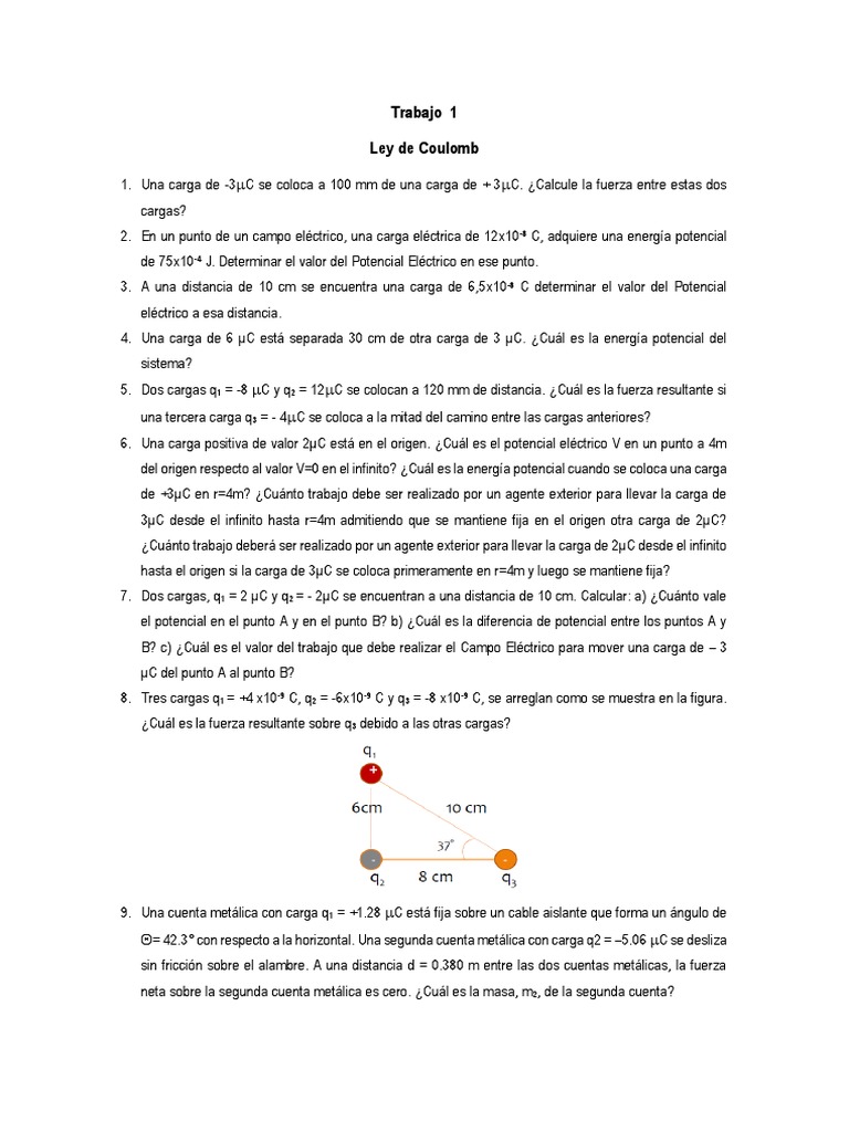 1. Una carga de -3C se coloca a 100 mm de una carga de + 3C. ¿Calcule la fuerza entre estas dos