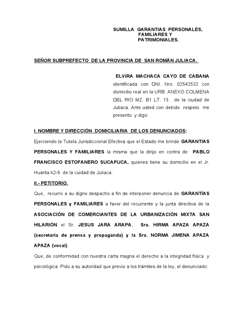 solicitamos que el denunciado, nos otorgue las más amplias garantías personales