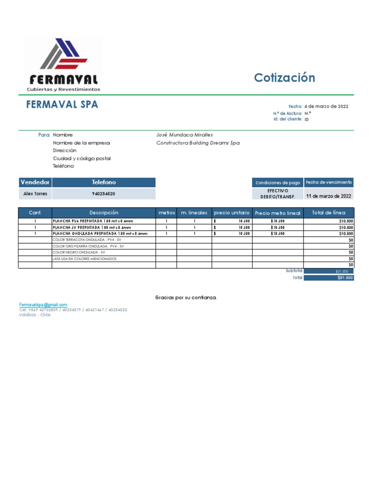 1 PLANCHA PV4 PREPINTADA 1.00 mt x 0.4mm 1 1 $ 10.500 $10.500 $10.500