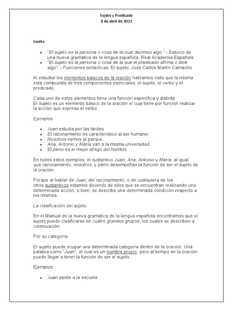 “El sujeto es la persona o cosa de la que el predicado afirma o dice
