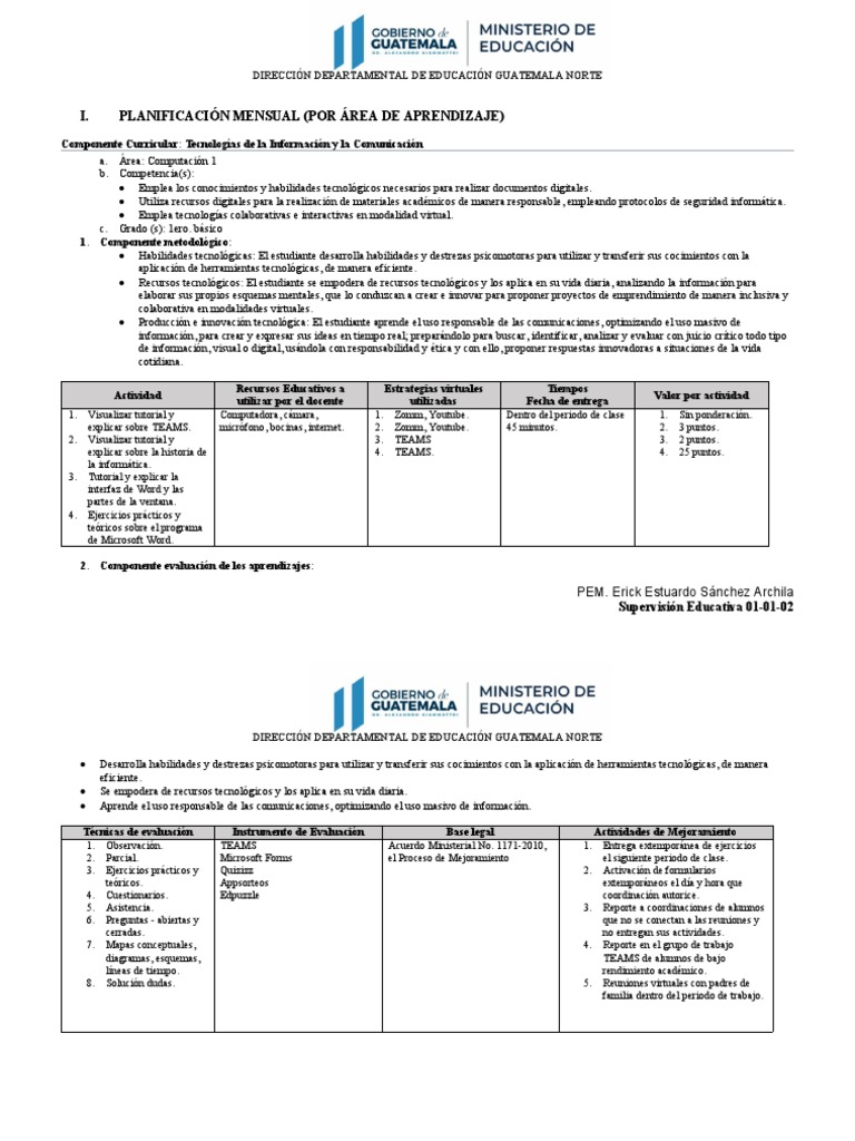 I. PLANIFICACIÓN MENSUAL (POR ÁREA DE APRENDIZAJE)