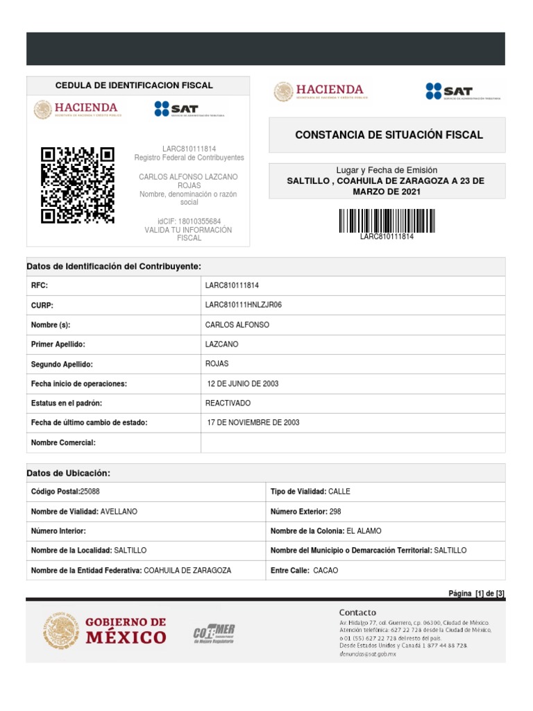 Cadena Original Sello: ||2021/03/23|LARC810111814|CONSTANCIA DE SITUACIÓN FISCAL|200001088888800000031||