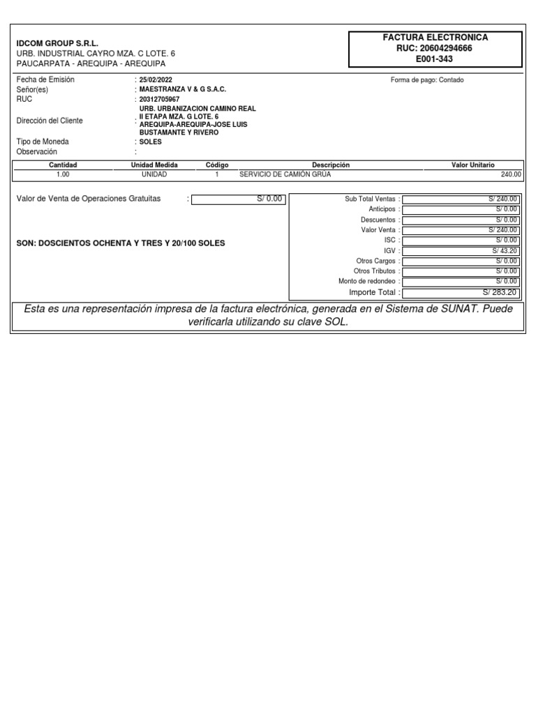 Esta es una representación impresa de la factura electrónica, generada en el Sistema de SUNAT. Puede