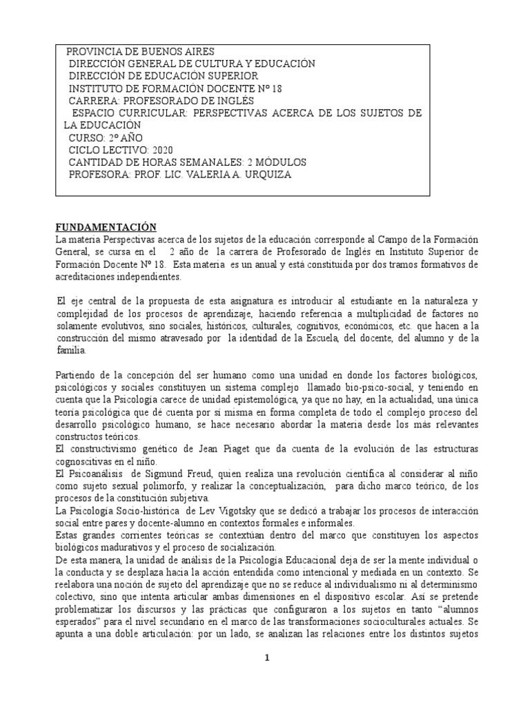ESPACIO CURRICULAR: PERSPECTIVAS ACERCA DE LOS SUJETOS DE