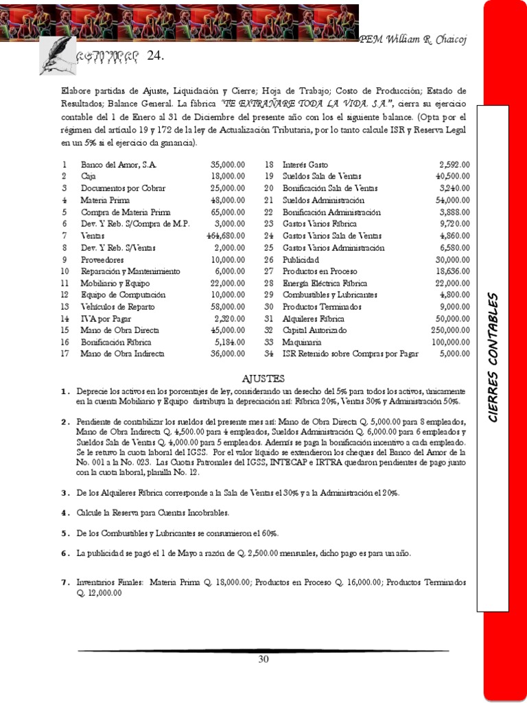 Elabore partidas de Ajuste, Liquidación y Cierre; Hoja de Trabajo; Costo de Producción; Estado de