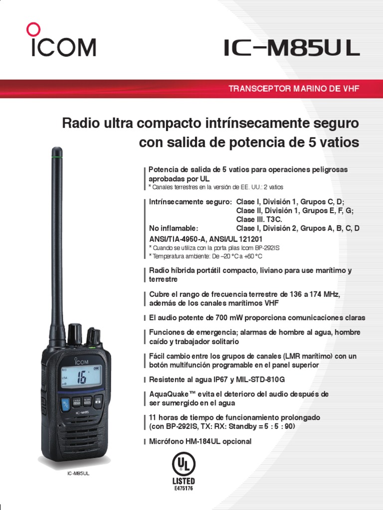 El IC-M85UL solo debe utilizarse con las opciones aprobadas intrínsecamente seguras especificadas. Potencia de SP interna 700 mW típica (a 10% de distorsión con 12 Ω load)