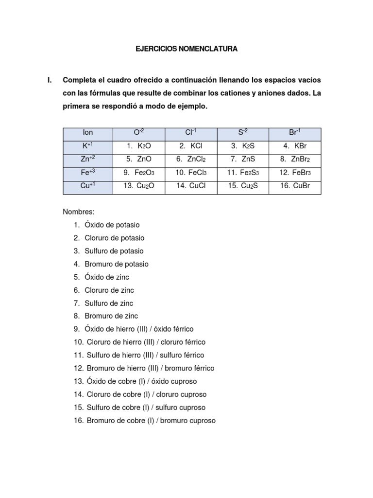 con las fórmulas que resulte de combinar los cationes y aniones dados. La