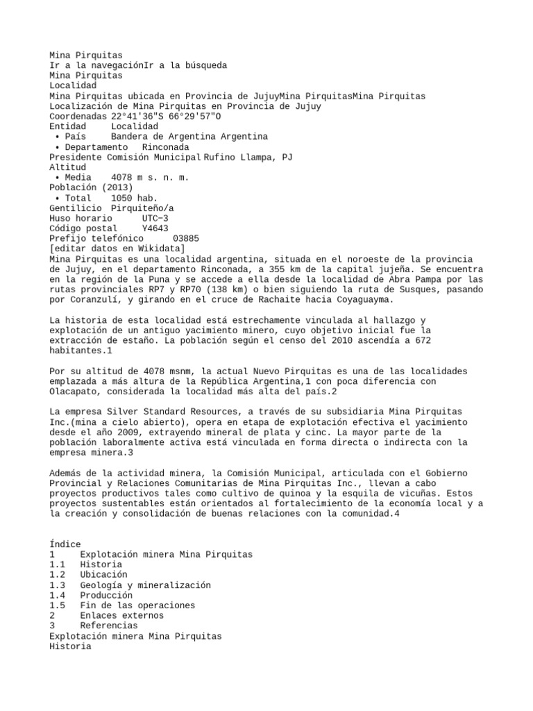 Historia de Mina Pirquitas en la Enciclopedia de Ciencias y Tecnologías en