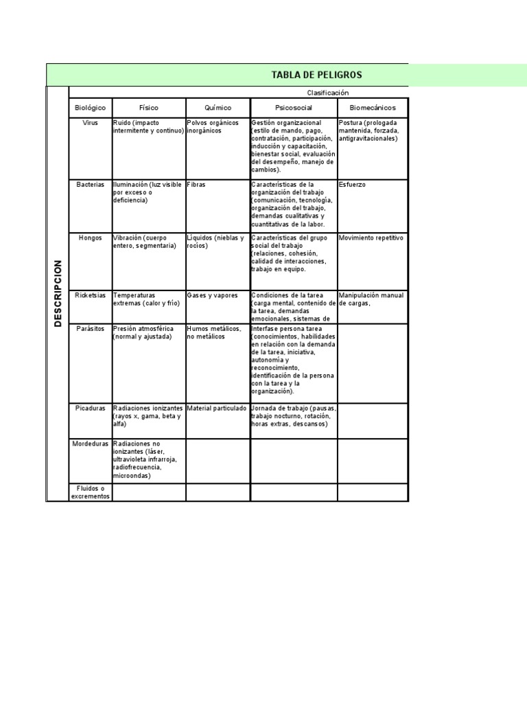 Pulir y marcar SI Biológico 5.1. Microorganismos (bacterias, parásitos, hongos o virus) 5.2. Realización de curaciones potencialmente infectadas 5.2 Infecciones o infestaciones agudas o crónicas 3 0 3 Exposicion Corta No aplica 2 3 6 Medio 25