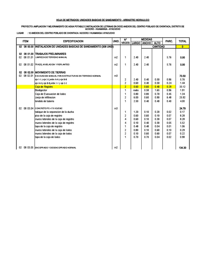 HOJA DE METRADOS: UNIDADES BASICAS DE SANEAMIENTO - ARRASTRE HIDRAULICO