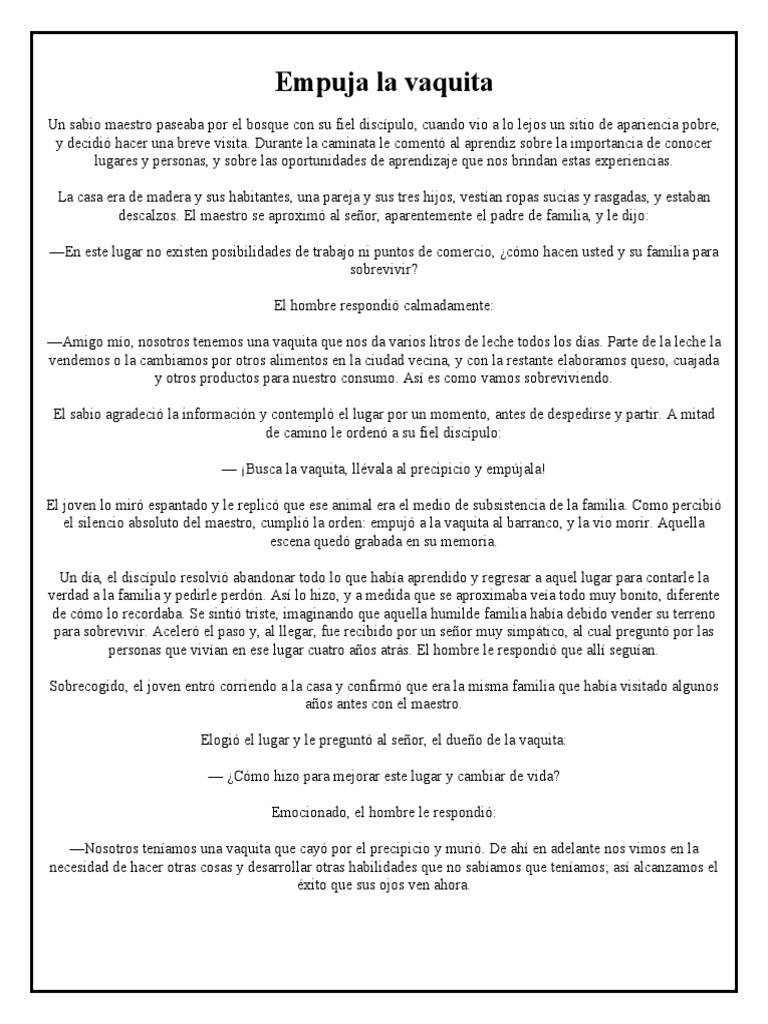 —Amigo mío, nosotros tenemos una vaquita que nos da varios litros de leche todos los días. Parte de la leche la