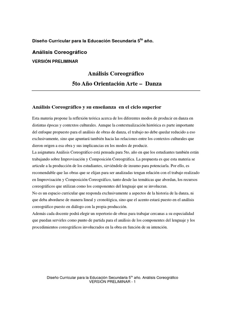 Diseño Curricular para la Educación Secundaria 5to año. Análisis Coreográfico
