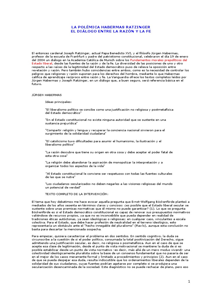 califica de aprendizaje recíproco entre razón y fe. La Vanguardia ofrece los textos completos leídos por