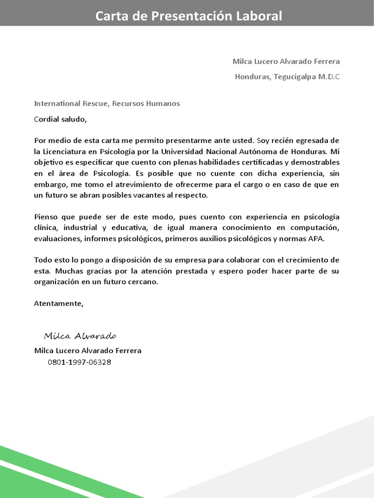 Por medio de esta carta me permito presentarme ante usted. Soy recién egresada de