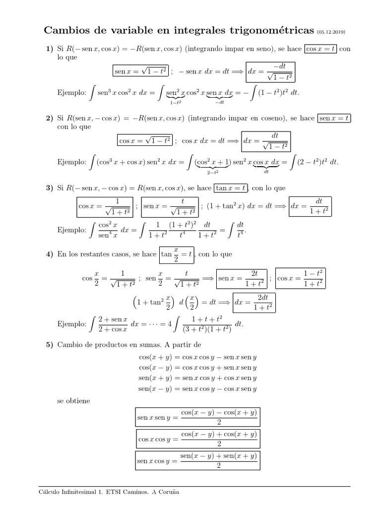 1) Si R(− sen x, cos x) = −R(sen x, cos x) (integrando impar en seno), se hace cos x = t con
