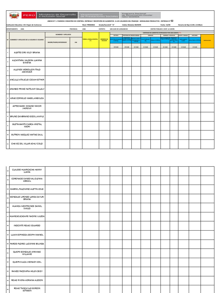 ANEXO N° 1: PADRON O REGISTRO DE CONTROL: ENTREGA Y RECEPCIÓN DE ALIMENTOS A LOS USUARIOS DEL PNAEQW - MODALIDAD PRODUCTOS - ENTREGA N° 02