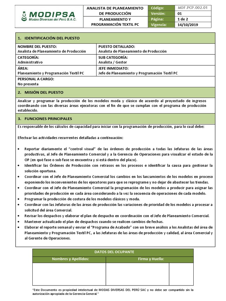 Planeamiento y Programación Textil PC Jefe de Planeamiento y Programación Textil PC