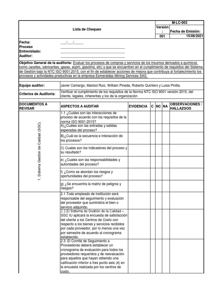 Equipo auditor: Javier Camargo, Marisol Ruiz, William Pineda, Roberto Quintero y Luisa Pinilla.