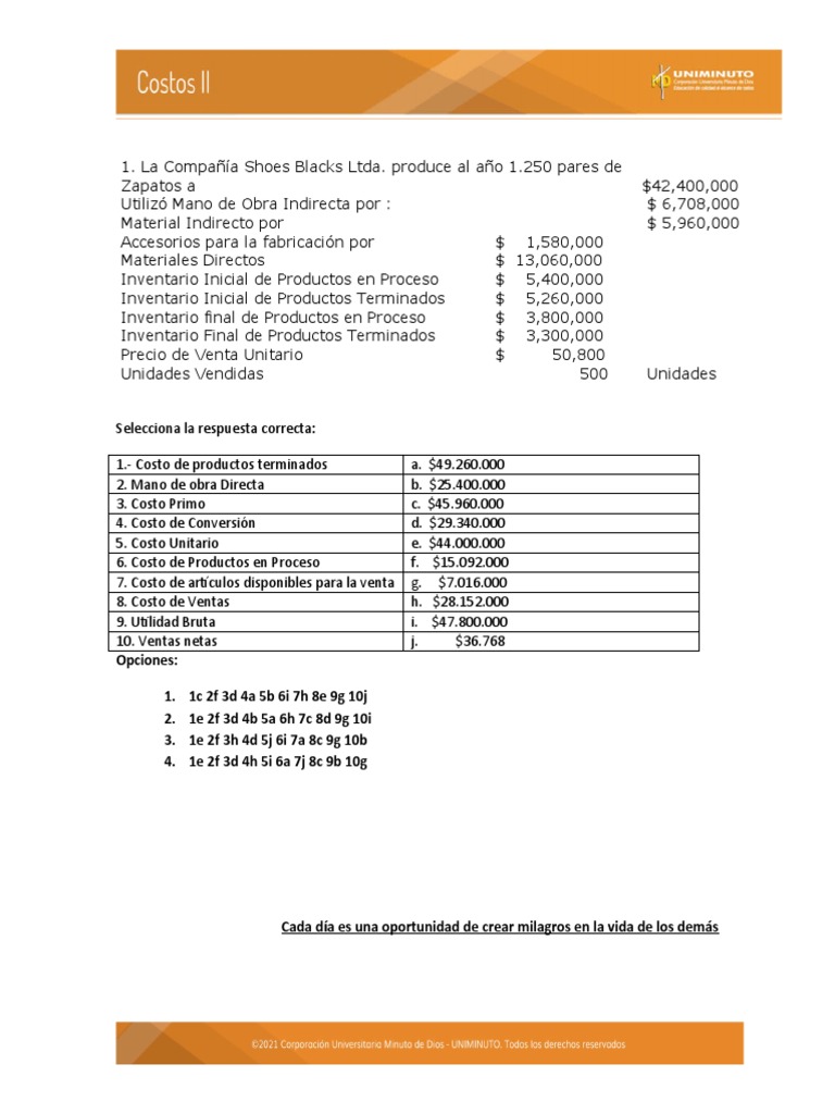 3. Costo de productos terminados. 4. Costo de la mano de obra directa.
