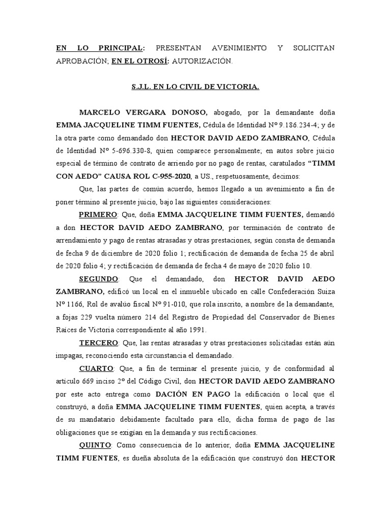 EN LO PRINCIPAL: PRESENTAN AVENIMIENTO Y SOLICITAN