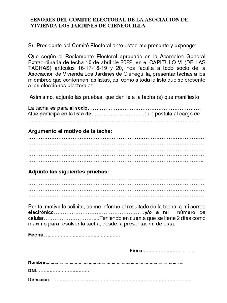 Asociación de Vivienda Los Jardines de Cieneguilla, presentar tachas a los