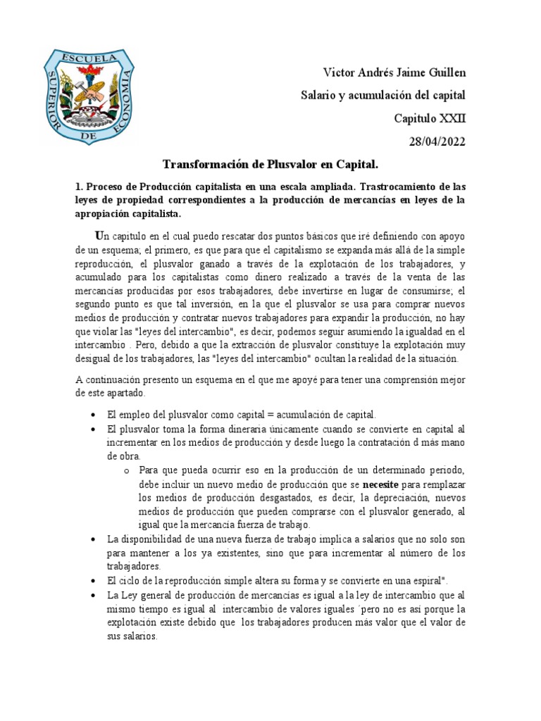 1. Proceso de Producción capitalista en una escala ampliada. Trastrocamiento de las
